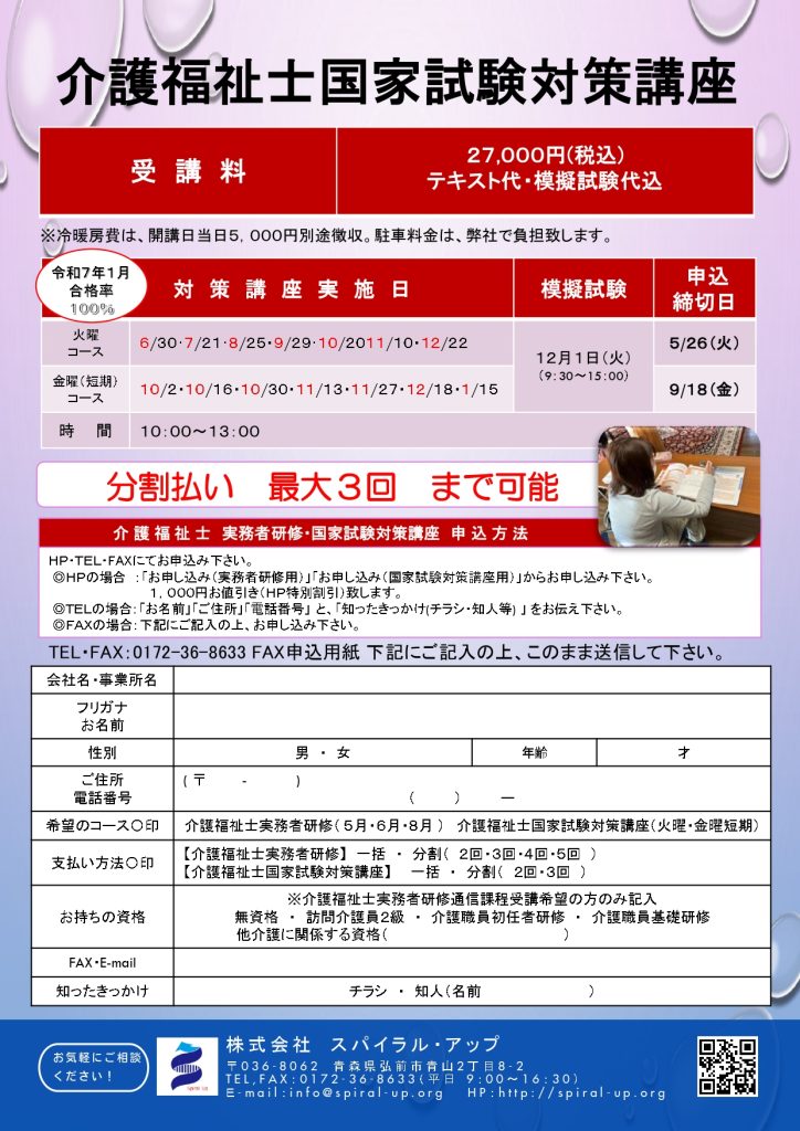 株式会社 スパイラル・アップ 弘前市青山2丁目8-2 営業時間 9:00~16:30 定休日 土日祝日 TEL・FAX 0172-36-8633